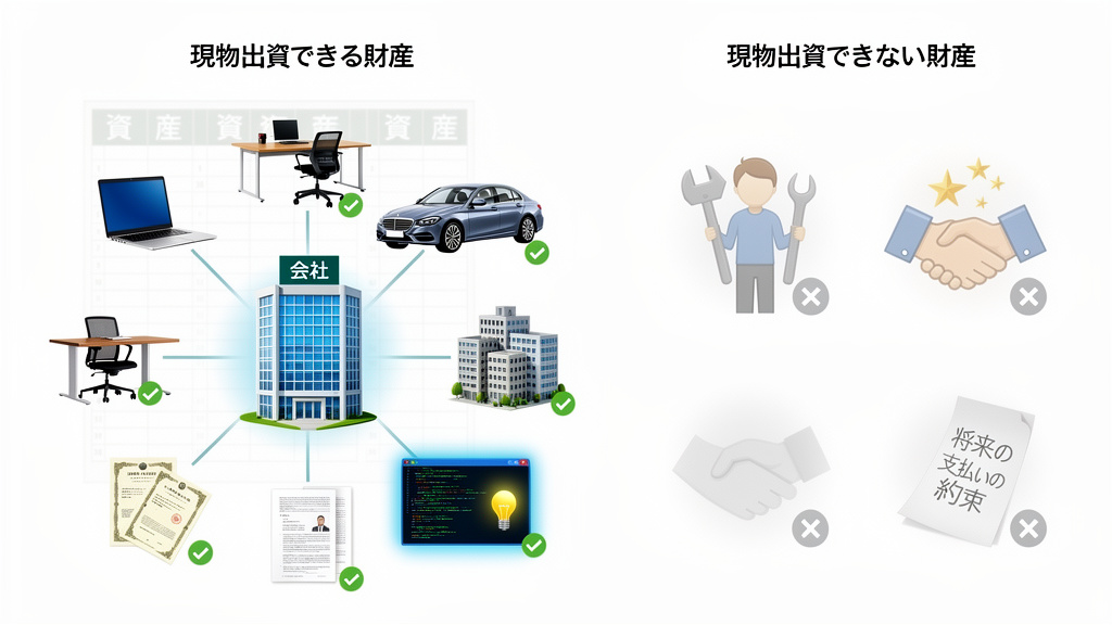 | 出資する財産 | パソコン、車、不動産、有価証券、ソフトウェアなどの「モノ」や「権利」 | 現金(日本円) |