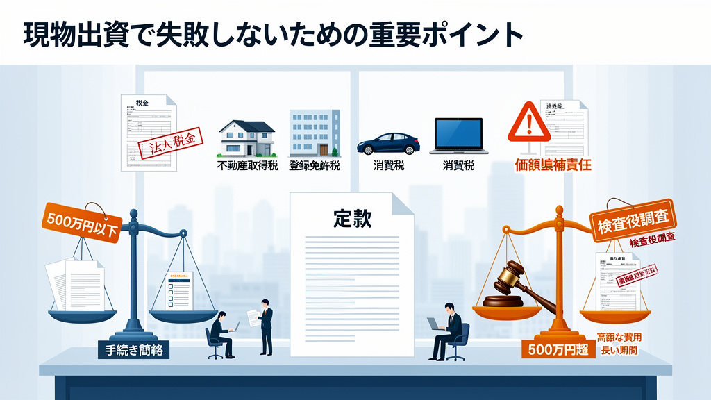500万円を超える現物出資を検討する際は、これらの手続きにかかるコストと時間を事前に把握しておくことが不可欠です。